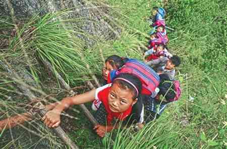 曾经,孩子们背着沉甸甸的书包,每天爬藤梯上下学。