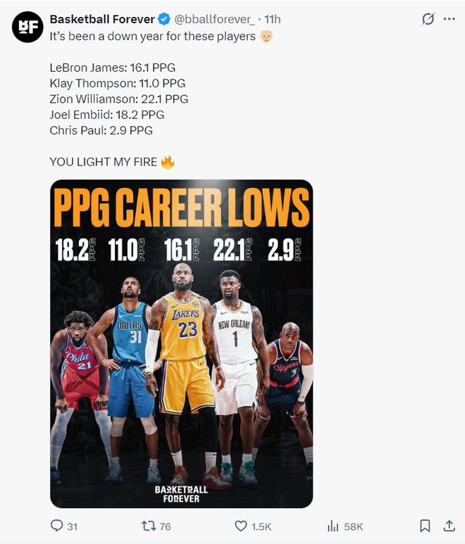 北京时间12月9日,美媒BF公布了本赛季五名球员的场均得分:詹姆斯16.1分、恩比德18.2分、克莱11分、锡安22.1分、保罗2.9分。美媒写道:这些球员本赛季处于慵懒状态。事实上,即将年满41岁的勒布朗刚刚打出了本赛季最强的一场比赛。 12月8日战胜费城的比赛中他砍下29+7+6+1+1,并在决胜时刻连续拿下10分帮助湖人队获胜。耐克官方写道:欲戴王冠,必先掂量。大家都应该明白这句话的意思。 ENSP记者Mark J. Spears评价詹姆斯本赛季的表现:本赛季的勒布朗有望成为联盟最伟大的第三分得分手。如果勒布朗是一支球队的第三得分手,那么这支球队将会很可怕。最好的事情是勒布朗不必每晚都表演。 (他暗示詹姆斯成功地改变了愤怒)相信你也看过NBA历史状元夸梅·布朗的播客。他说詹姆斯不如科比和乔丹,因为没有人害怕勒布朗。他总觉得勒布朗不是一个主要球员。他没有乔丹和科比那样的杀手品质。本赛季,湖人队有五人场均得分上双。詹姆斯场均贡献16.1分7.6助攻4.7篮板0.7抢断0.3盖帽,投篮命中率46.4%,三分球命中率33.3%,正负值+1.7。他是球队的第三得分手。这41岁了,统计数据不好吗?德雷蒙德·格林在他的个人播客中再次谈到他相信勒布朗·詹姆斯比迈克尔·乔丹更好。他的理由如下:(结论,对我来说,勒布朗比乔丹更好,可能有人觉得我疯了)1、詹姆斯是2005年联盟第一人,2020年仍然是联盟第一人,待机时间长,无论比赛情况如何,他都是最好的; 2、乔丹总决赛的对手从来都不是超级球队,勒布朗总决赛面对的是超级球队; 3、詹姆斯可以在重大比赛中连续命中8-9个进球,无需暂停,而乔丹在关键时刻总是要暂停休息;